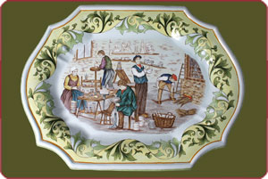 This big dish, untitled "The faiencier's jobs" is the last creation of the Manufacture. It illustrates the HB-Henriot Faiencerie know-how, from the moulds' creation to the free hand decoration and the firing. Limited and numbered edition to 12 pieces. |